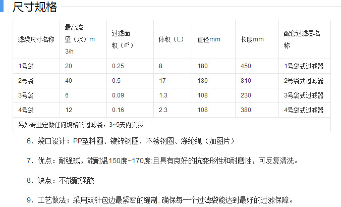 特點(diǎn): · 尼龍單絲和復(fù)絲 · 過(guò)濾精度 · 良好的抗變形性和耐磨性 用途:塑環(huán)超聲波焊接過(guò)濾袋:環(huán)口及袋身接合處均采用焊接,環(huán)口可根據(jù)需要選擇不同直徑不同型狀的塑質(zhì)環(huán)口,過(guò)濾材料也可選用不同精度或不同材質(zhì)的各種濾材,通常應(yīng)用于精度比較高的濾袋。 尼龍過(guò)濾袋 尼龍過(guò)濾袋采用高強(qiáng)度的尼龍編織網(wǎng)車(chē)縫制成,且均采用獨(dú)特的包邊技術(shù),在大程度上防止針眼泄漏,將過(guò)濾中比自身網(wǎng)眼大的雜質(zhì)截留在材料表面;直徑小于網(wǎng)孔目數(shù)的顆粒則穿過(guò)網(wǎng)孔進(jìn)入下游,因此尼龍單絲過(guò)濾袋實(shí)現(xiàn)了表面過(guò)濾,光滑的表面也便于清洗,可反復(fù)使用。 建議精度中文名尼龍過(guò)濾袋品 名NMO過(guò)濾袋/尼龍單絲過(guò)濾袋材 質(zhì)尼龍單絲或錦綸單絲(簡(jiǎn)稱(chēng)NMO)應(yīng) 用食品飲料、化工行業(yè),其他行業(yè)